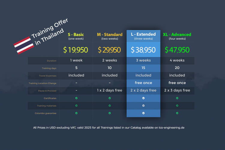 มีคำถามเกี่ยวกับหลักสูตรของเราหรือต้องการการฝึกอบรมที่ปรับให้เหมาะกับองค์กรของคุณหรือไม่? โปรดส่งอีเมลมาที่ info@asia.tcs-engineering.de